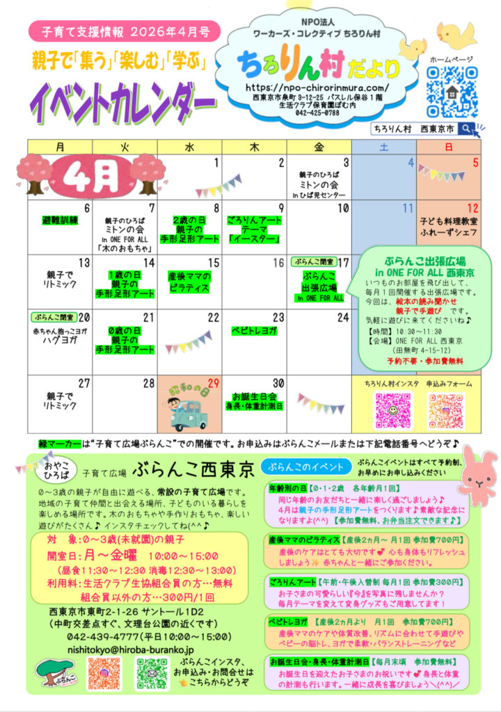 ワーカーズ・コレクティブちろりん村は、西東京市内で活動する子育て支援団体です。地域の親子とつながり、子育てが楽しくなる講座やママの居場所づくりをしています。